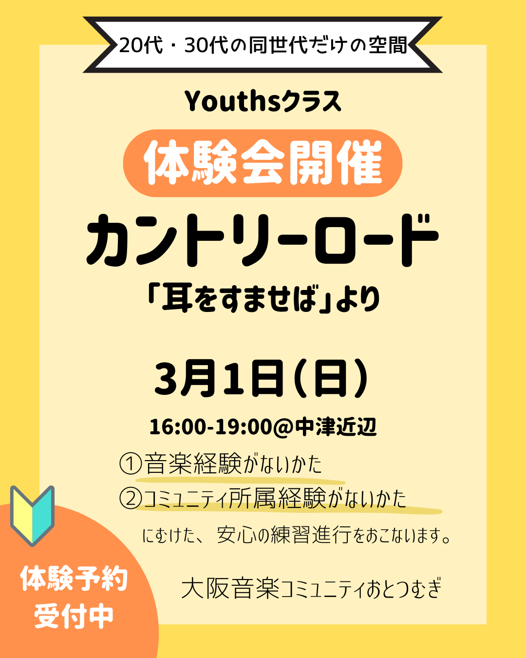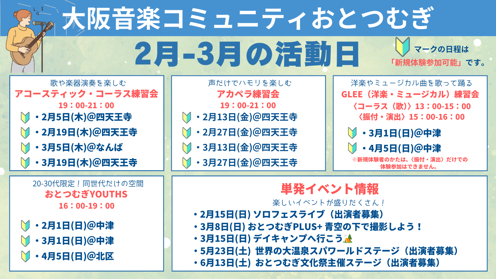 【1】木曜日クラス(コーラス・アコースティック演奏等を楽しむクラス) 月2回 木曜日 19:00-21:00 【2】金曜日クラス(アカペラを楽しむクラス) 月2回 金曜日 19:00-21:00 【3】日曜日クラス(Glee(洋楽・ミュージカル)コーラスクラス) 月1回 日曜日 〈コーラス(歌)パート〉13:00-15:00 〈振付・演出パート〉15:00-16:00 ※片方だけの参加可能 【4】うたってみた部(コミュニティ内の部活動) 不定期 日曜日 ※コミュニティレギュラー会員のみ参加可能 【5】おとつむぎYouths(20・30代のための音楽グループ) 月1回 日曜日 16:00-19:00 ※コミュニティ内20・30代会員のみ参加可能 【6】その他単発イベント 土日 不定期開催 ※祝日や長期連休・別イベントと重なる場合等、日程変動あり。 ※途中参加・途中退席OK |